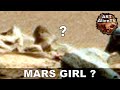 " What looks like a little girl or toy doll on Mars that has brown hair, button like eyes and seems to be wearing a white dress. Next to a strange animal statue by a possible alien/figure crushed under a rock. All in a row on a ridge. You can see the alien foot and hand sticking out. He has 5 toes and fingers like a human although he seems to have a mid tarsal break on his foot more like a Neanderthal or Bigfoot.